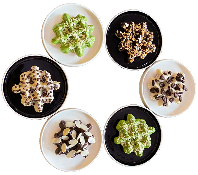 Tiramisu Oreo, Green Tea Almond, Choco Peanut, White Pebbles, Cappucinno, Strawberry Oreo.
